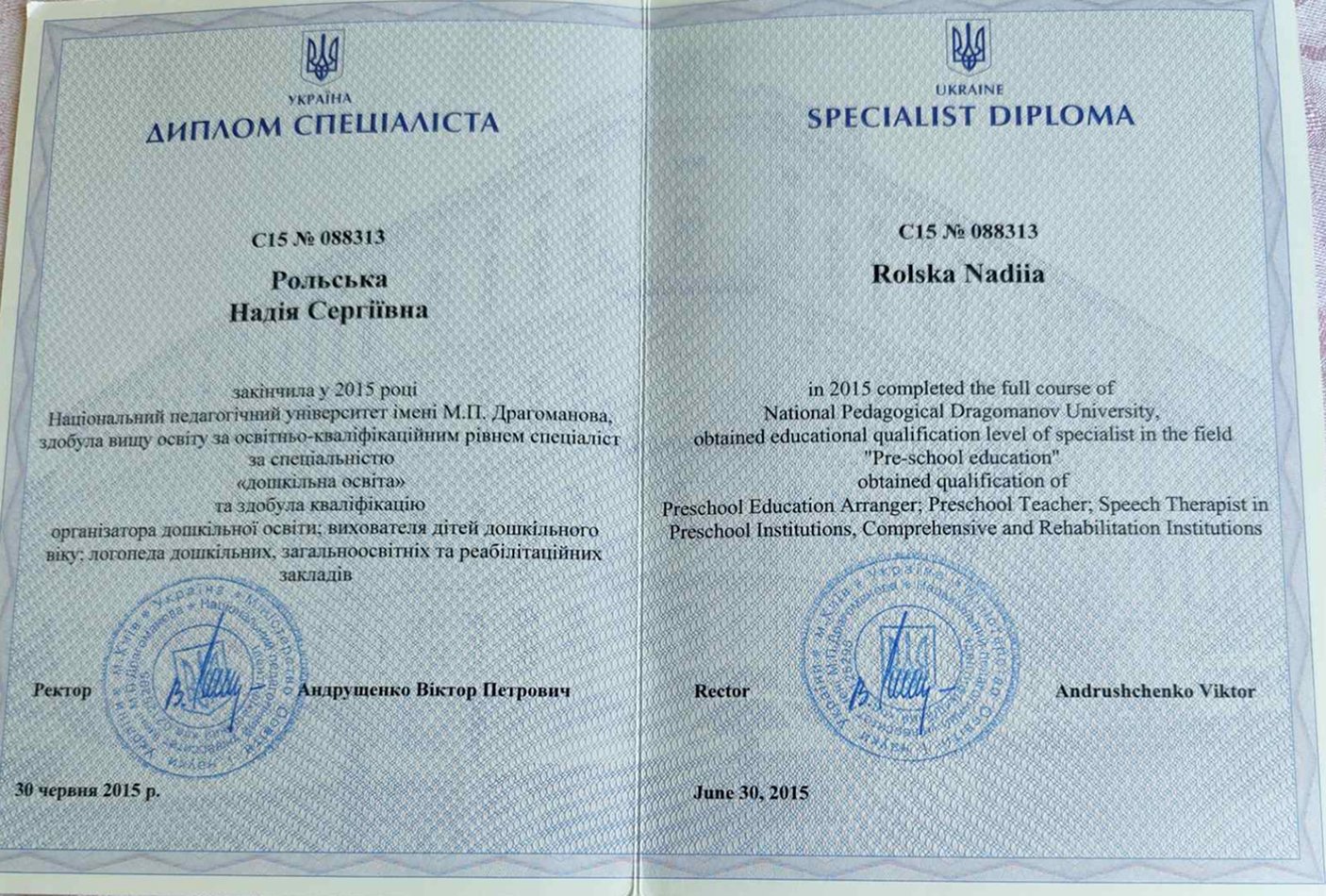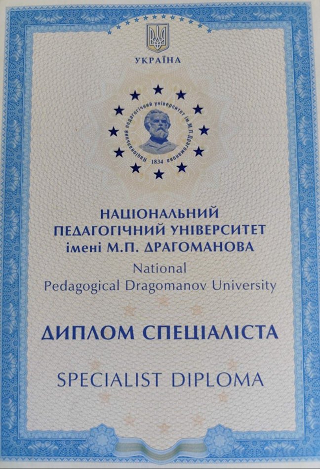 - Національний педагогічний університет імені М. П. Драгоманова, за спеціальністю “Дошкільна освіта”, та здобула кваліфікацію організатора дошкільної освіти, вихователя дітей дошкільного віку, логопеда дошкільних, загальноосвітніх та реабілітаційних закладів, 2015 р.