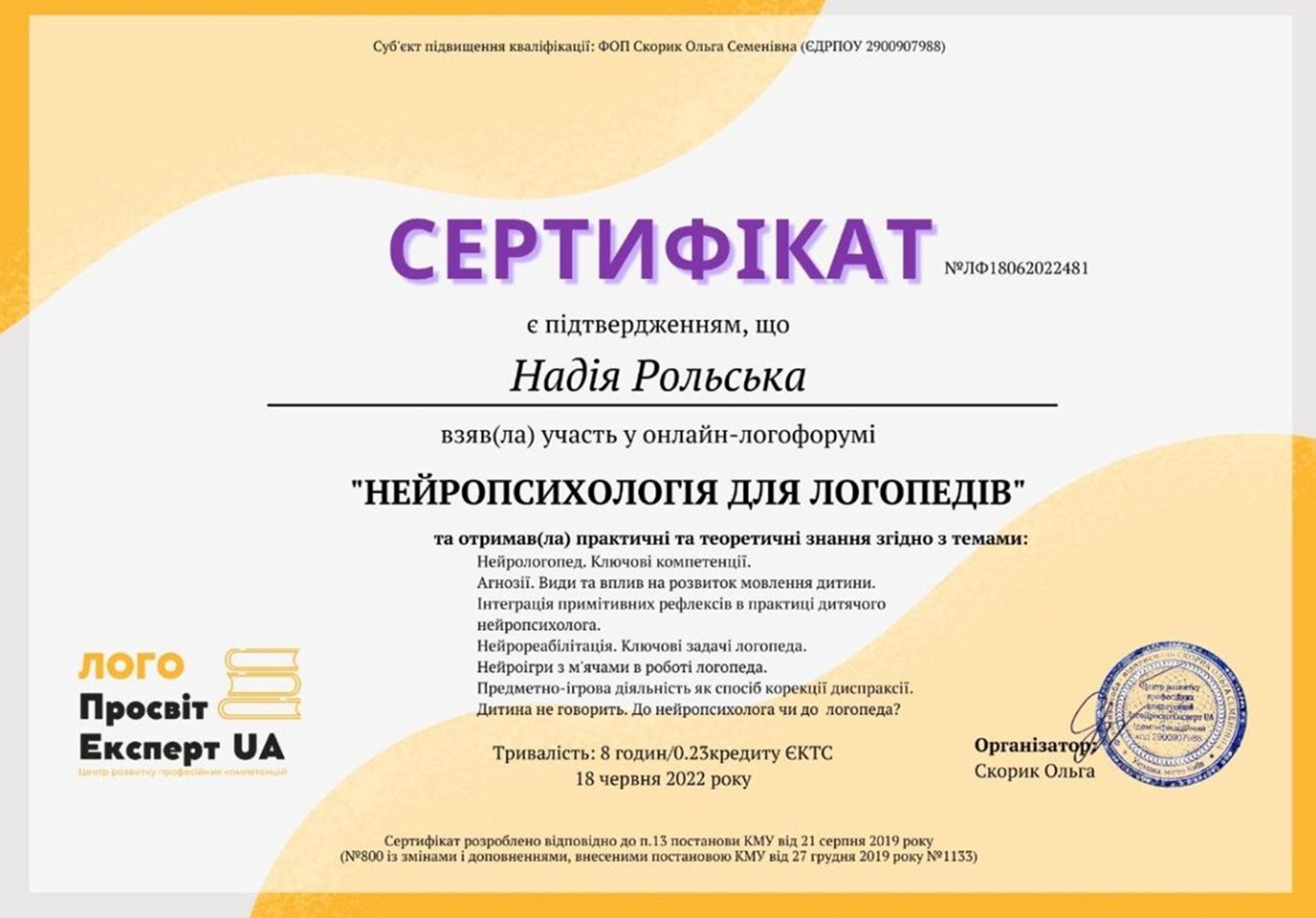 - Участь у онлайн-логофорумі “Нейропсихологія для логопедів” Суб’єкт підвищення кваліфікації: ФОП Скорик Ольга Семенівна, 2022 р.