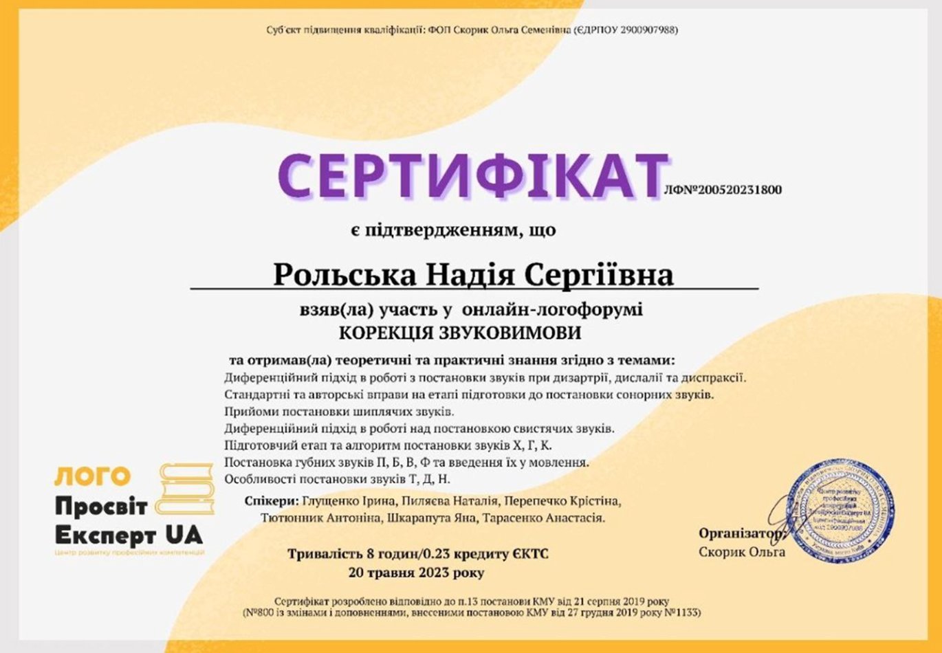 - Участь у онлайн-логофорумі “Корекція звуковимови” Суб’єкт підвищення кваліфікації: ФОП Скорик Ольга Семенівна, 2023 р.