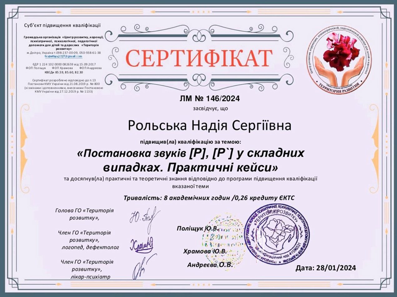 - Підвищення кваліфікації “Постановка звуків (Р), (Р’) у складних випадках. Практичні кейси”, суб’єкт підвищення кваліфікації Громадська організація “Центр розвитку, корекції, психіатричної, психологічної, педагогічної допомоги для дітей та дорослих “Територія розвитку”, 2024 р.