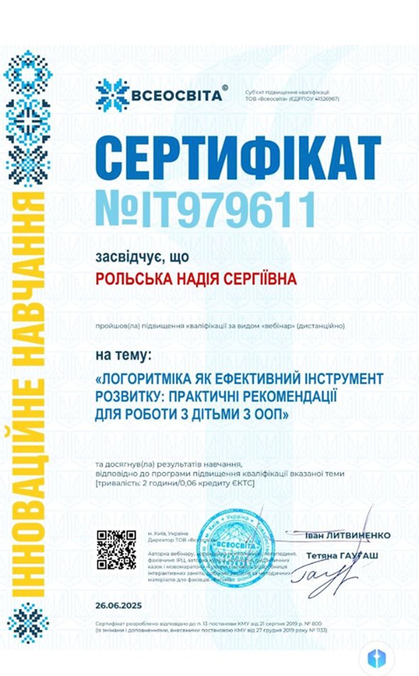 - Підвищення кваліфікації за видом “вебінар” (дистанційно), на тему: “Логоритміка як ефективний інструмент розвитку: практичні рекомендації для роботи з дітьми з ООП”, суб’єкт підвищення кваліфікації ТОВ “Всеосвіта”, 2025 р.